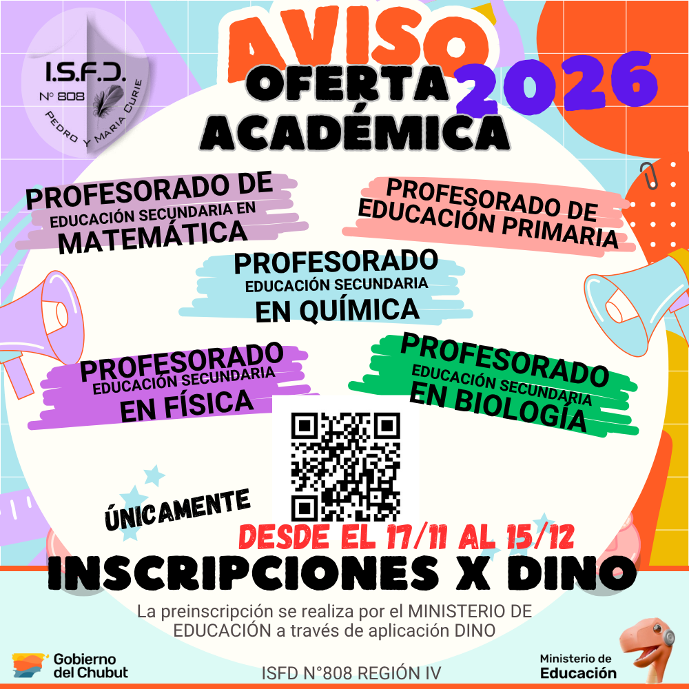 Se encuentra abierta la preinscripción a los Profesorados del ISFD N°808 en la plataforma DINO desde el 17/11/2025 hasta el 15/12/2025.
